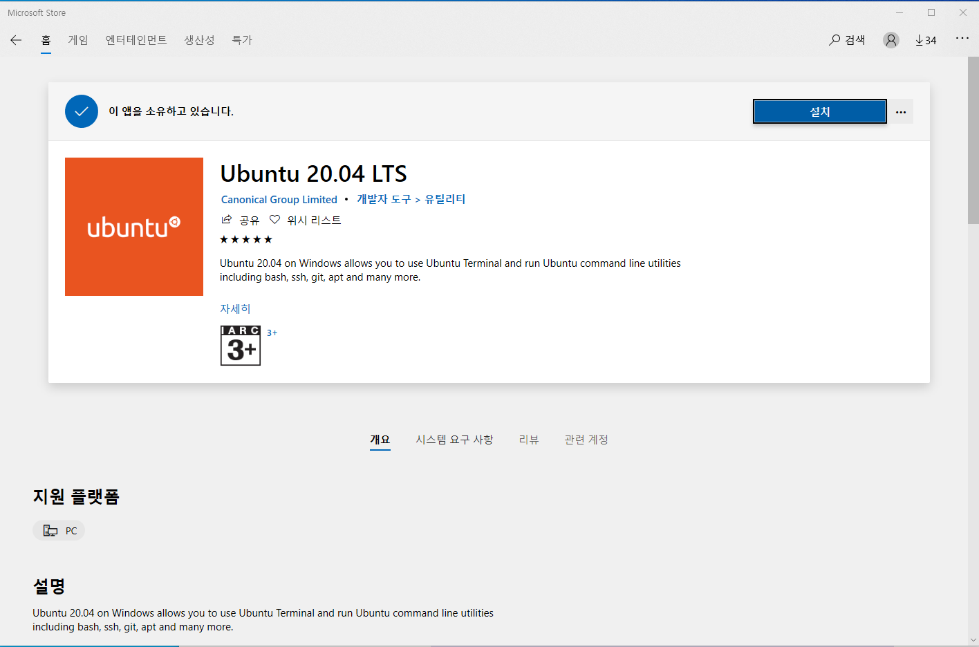 - Microsoft Store에서 Ubuntu를 검색하여 설치합니다.