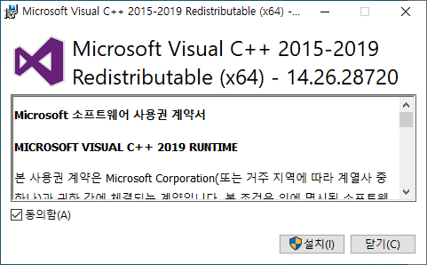 - 창이 하나 뜨면서 Visual C++ 재배포 가능패키지의 설치가 필요하다는 팝업창이 뜹니다.