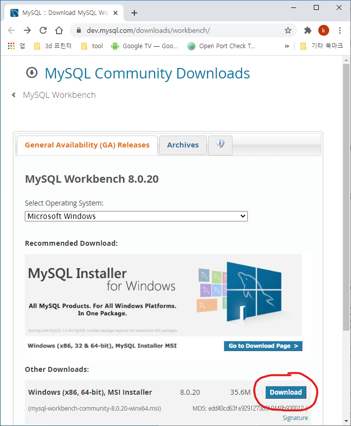 - mysql-workbench-community-8.0.20-winx64.msi 파일이 다운로드됨을 확인 합니다.