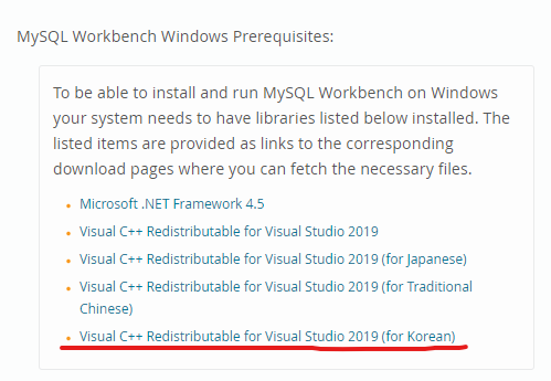 - 클릭이후 화면 전환되며 페이지 중간 정도에 MySQL Workbench Windows Prerequisites 항목이 있습니다.