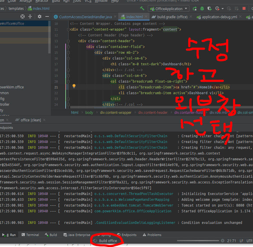 * html, javascript 등 수정후 intellij 밖의 창 선택. 그럼. 재빌드 됨을 확인 할 수 있다.