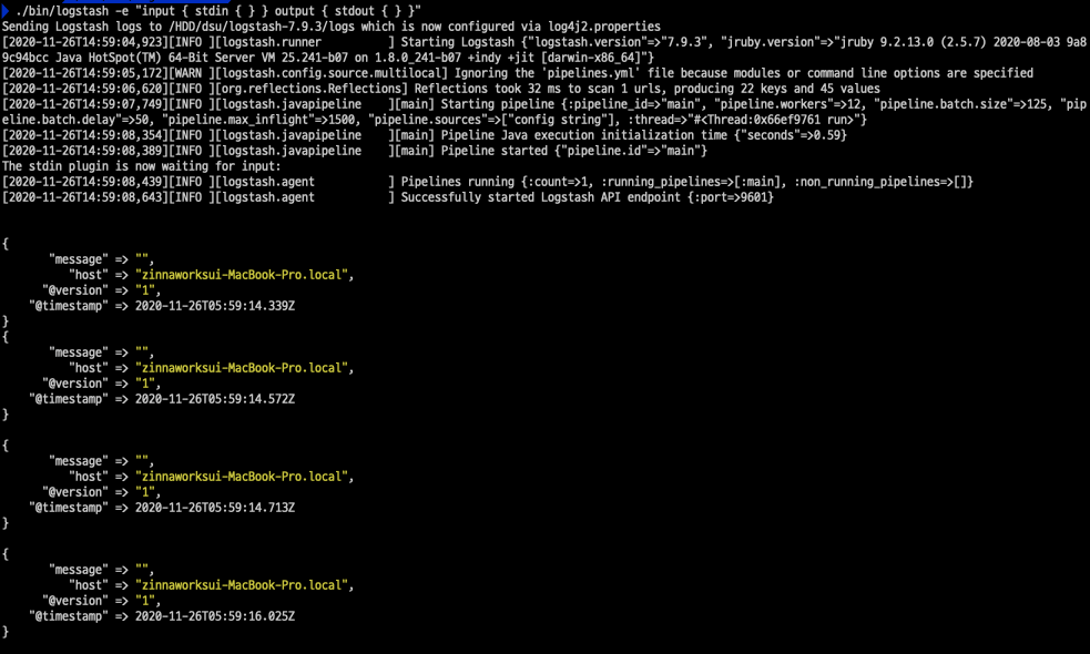 ./bin/logstash.bat -e "input { stdin { } } output { stdout { } }"
