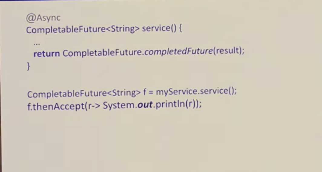 | @Configuration @EnableAsync public class AsyncThreadConfiguration{ @Bean(name="asyncThreadPoolTaskExecutor") publicExecutorasyncThreadTaskExecutor(){ ThreadPoolTaskExecutort hreadPoolTaskExecutor = new ThreadPoolTaskExecutor(); threadPoolTaskExecutor.setCorePoolSize(10); threadPoolTaskExecutor.setQueueCapacity(50); threadPoolTaskExecutor.setMaxPoolSize(100); threadPoolTaskExecutor.setThreadNamePrefix("TASK-POOL"); returnt hreadPoolTaskExecutor; } } |