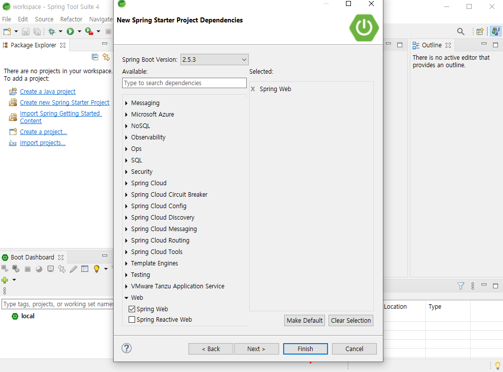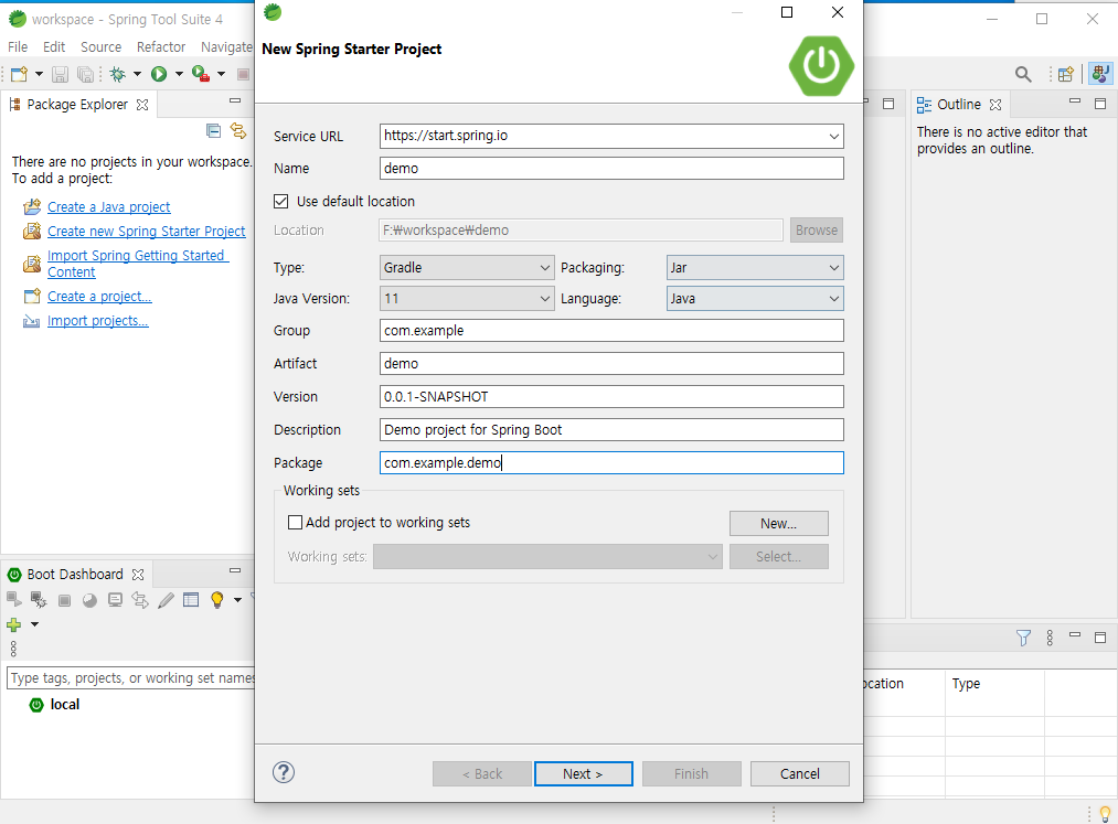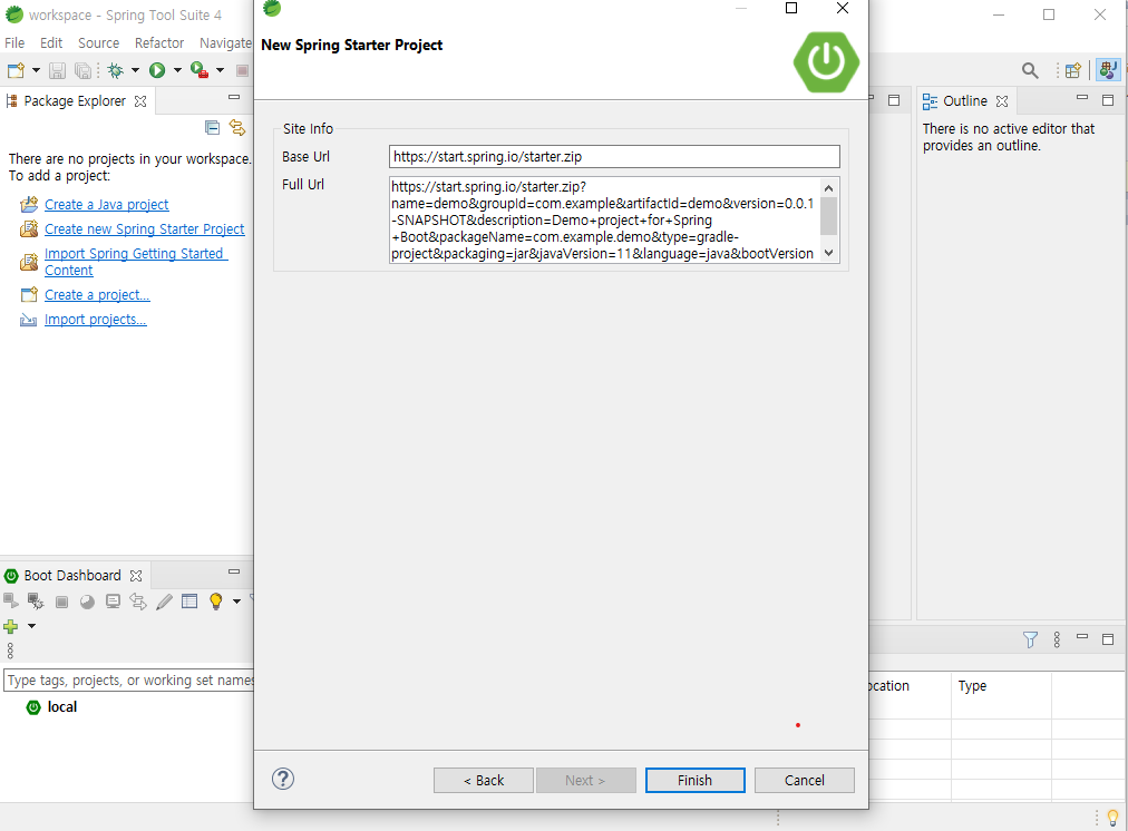 Spring boot 구성 최종 정보 확인 Finish 버튼 입력시 프로그래스바가 100%를 향해 진행된다 ( 각종 dependency를 다운로드 함 )