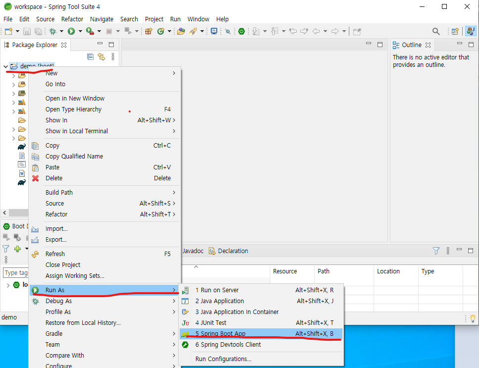 Spring boot 실행확인 프로젝트 > 오른쪽 메뉴 > Run As > Spring Boot App