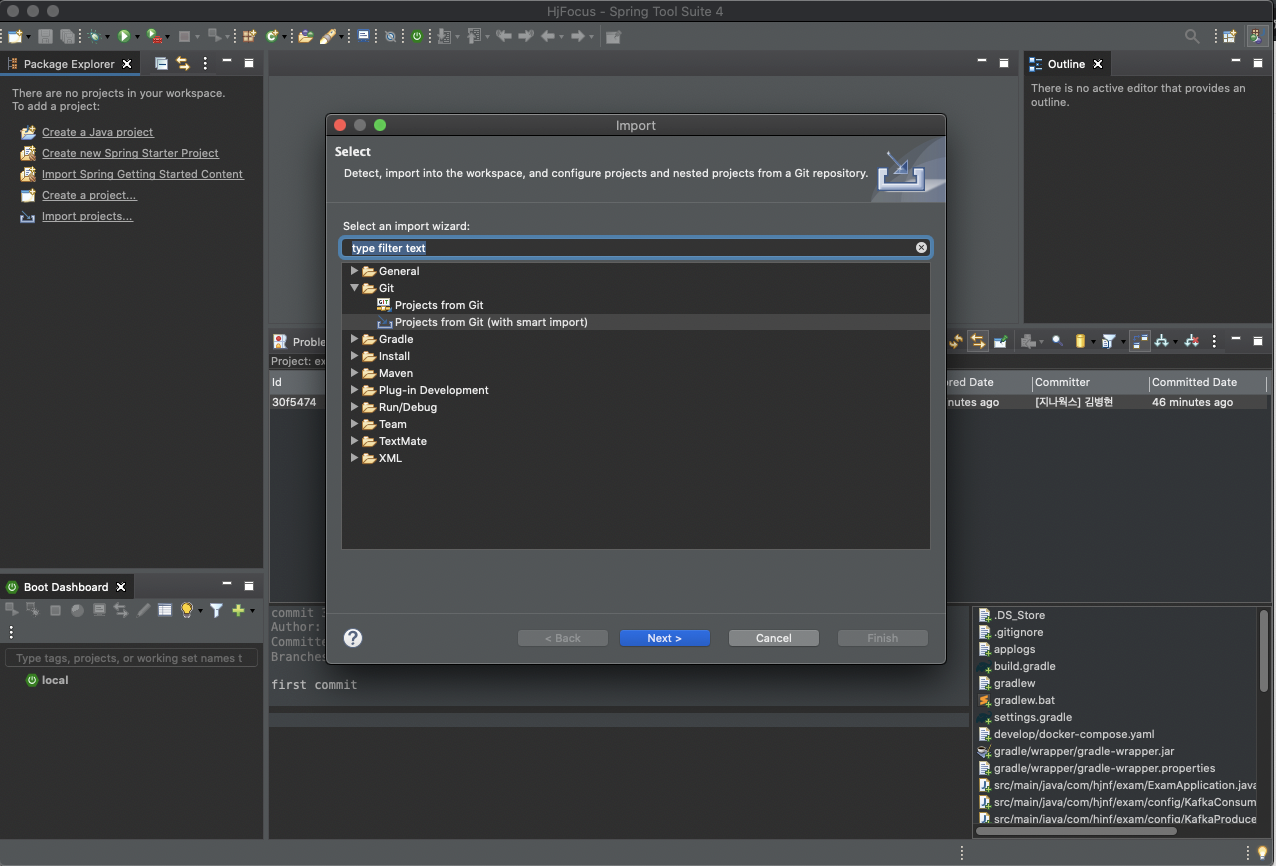 - 메뉴 -> file > import > git > project from git(with smart import)선택