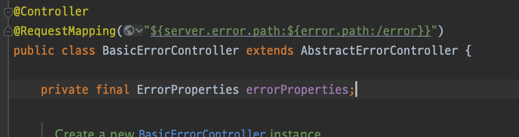 - spring boot에서의 Error 처리설정 및 경로 설정은 BasicErrorController 에서 설정된다. 기본값은 "/error"
