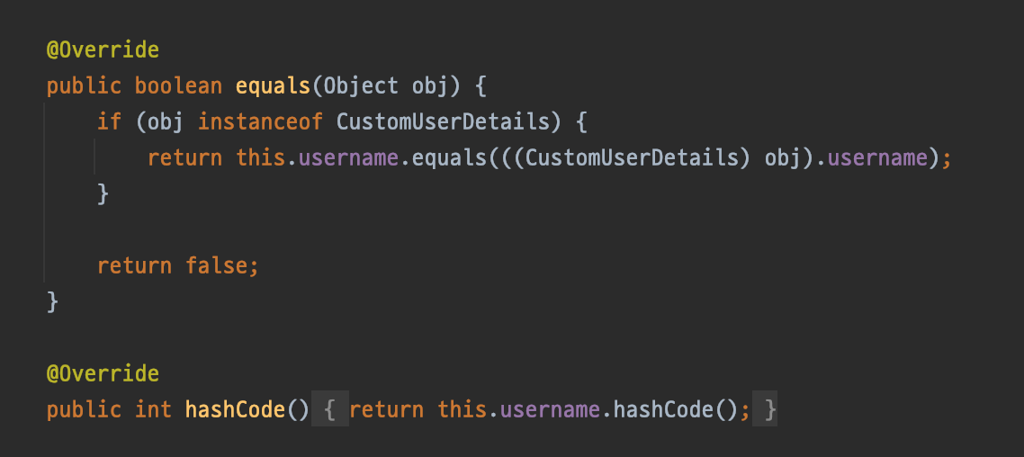 중복로그인 처리를 진행하도록 되어 있다. - 따라서 userDetails 를 custom 하게 구현했다면 반드시 equals, hash 등의 메소드에 대한 처리가 동반되어야 같은 유저임을 확인할 수 있다.