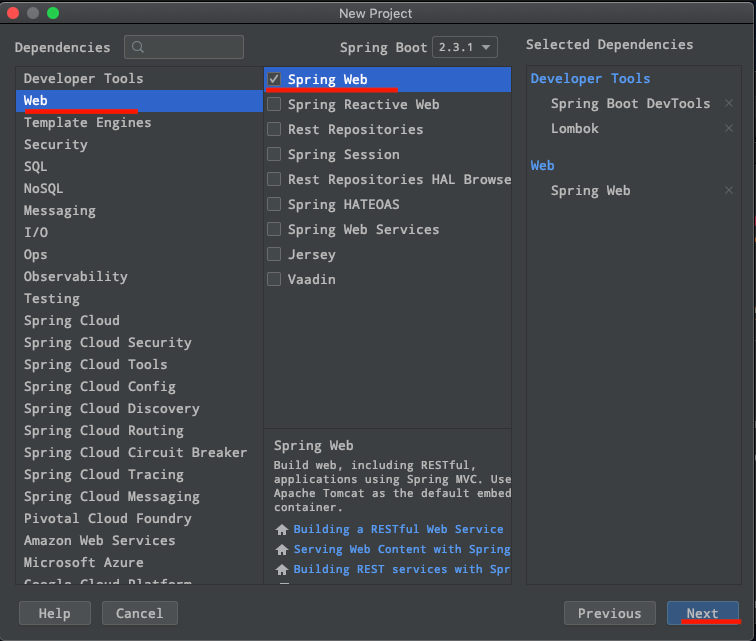 Web 항목에서는 기본 web application을 만들것이므로 spring web 을 선택합니다.